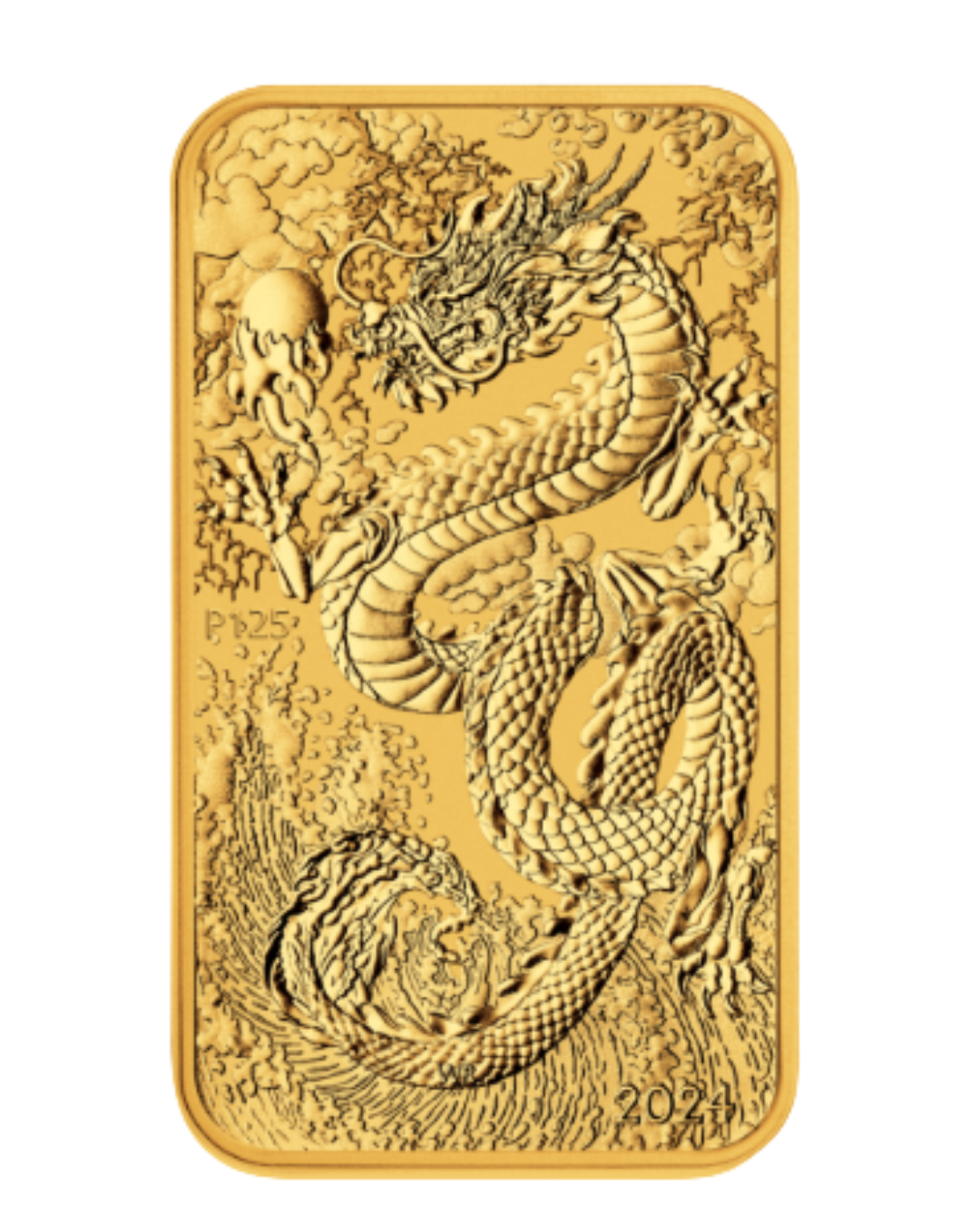 The reverse portrays a striking image of an oriental dragon eyeing a flaming pearl, a symbol of wisdom. The background includes representations of water over which the dragon has control, and clouds, omens of good luck. The design also incorporates the inscription ‘2024’, which in lunar mythology is the Year of the Dragon, and a ‘P125’ mintmark signifying The Perth Mint’s 125th anniversary.