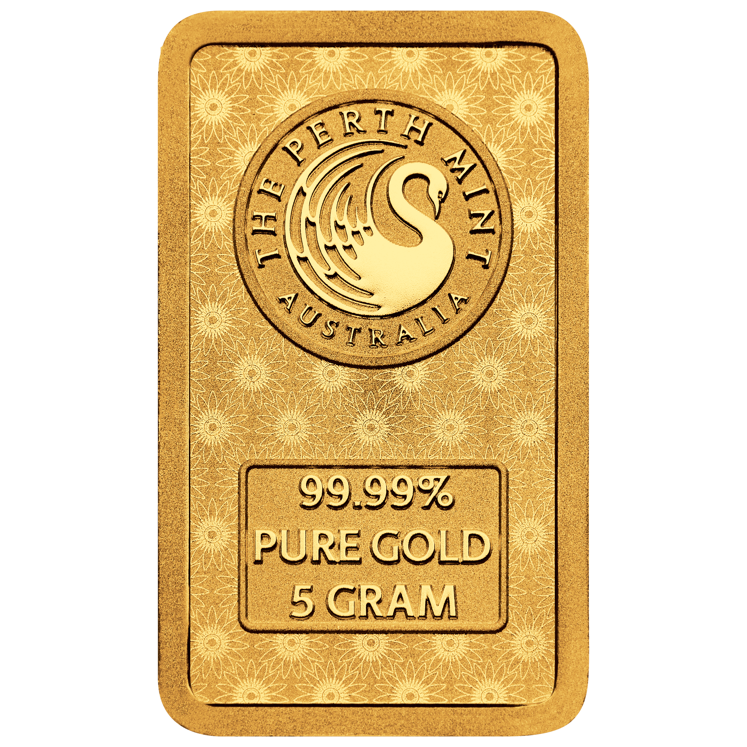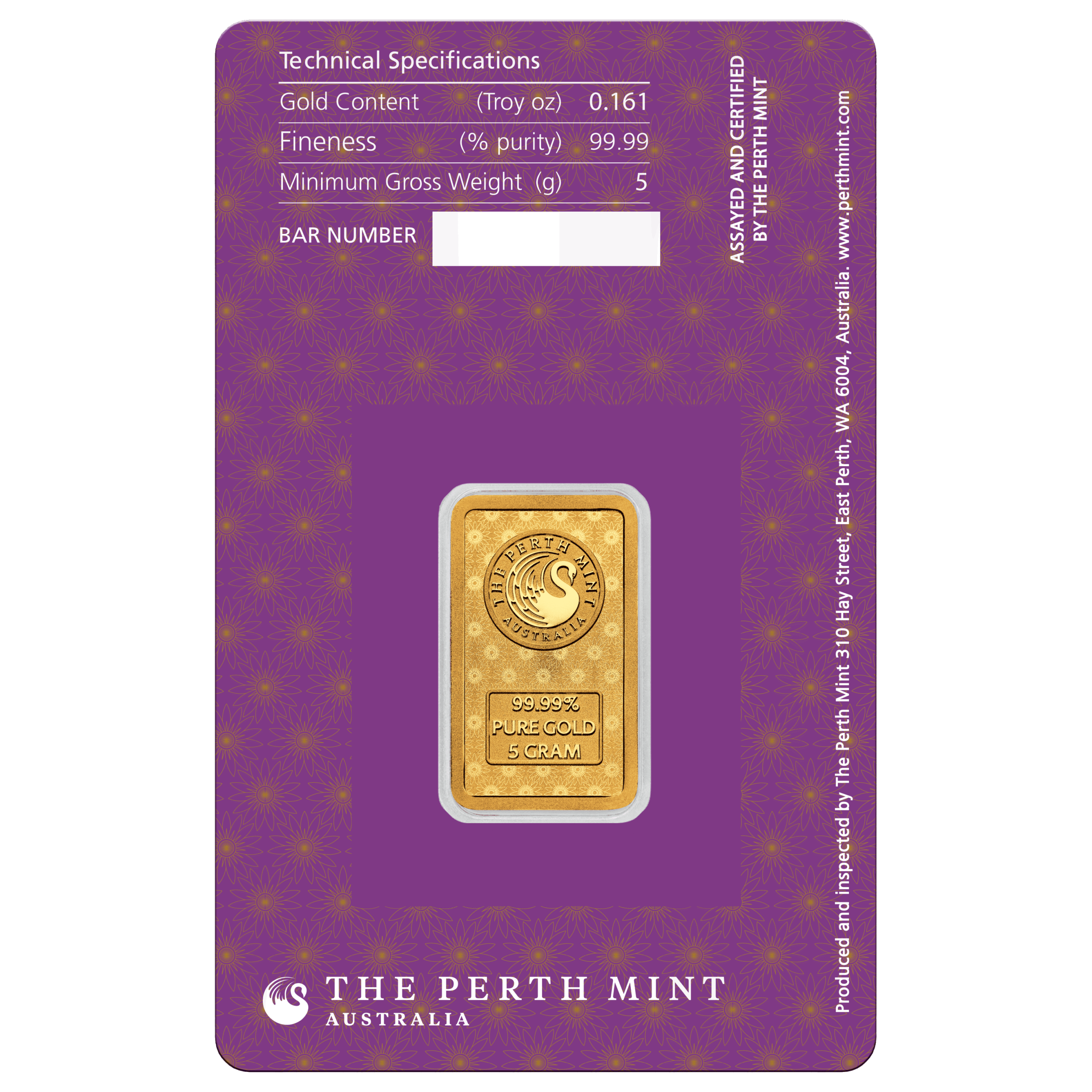 Obverse: Displays The Perth Mint’s official logo against an elegant floral patterned background. It also carries the bar’s weight and purity.