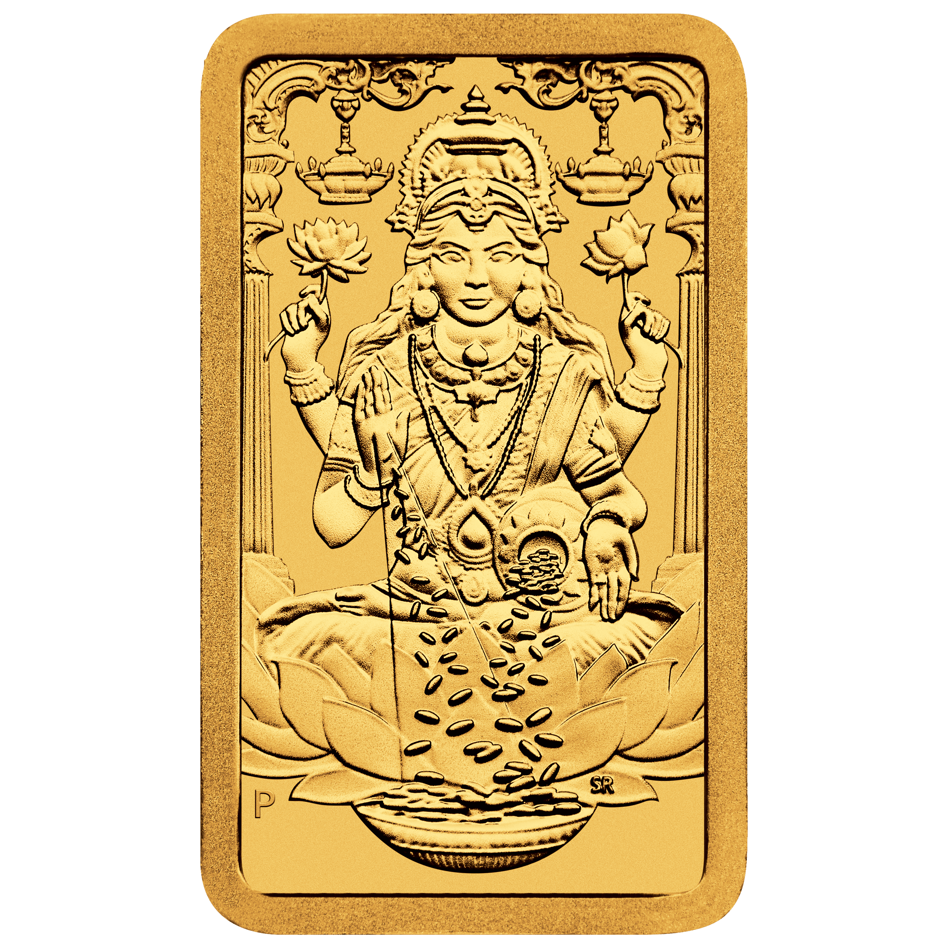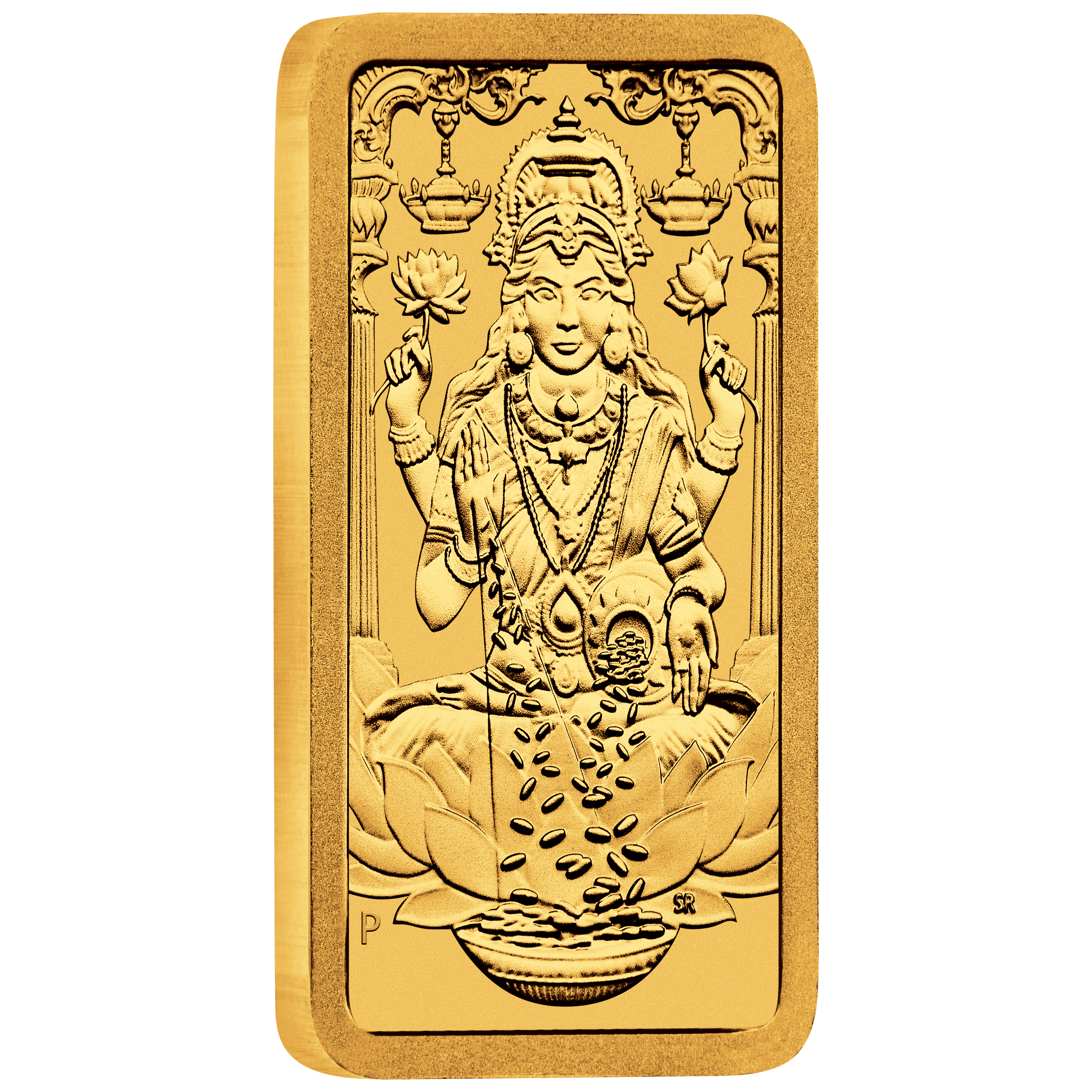 Reverse: Features a finely detailed image of Goddess Lakshmi, seated gracefully on lotus flowers, holding them in her hands. A bowl overflowing with coins rests before her, symbolizing prosperity, while coins cascade from her palm and a vessel by her side. Ornamental pillars adorned with hanging lamps frame the divine artwork. The Perth Mint’s “P” mintmark completes the design.